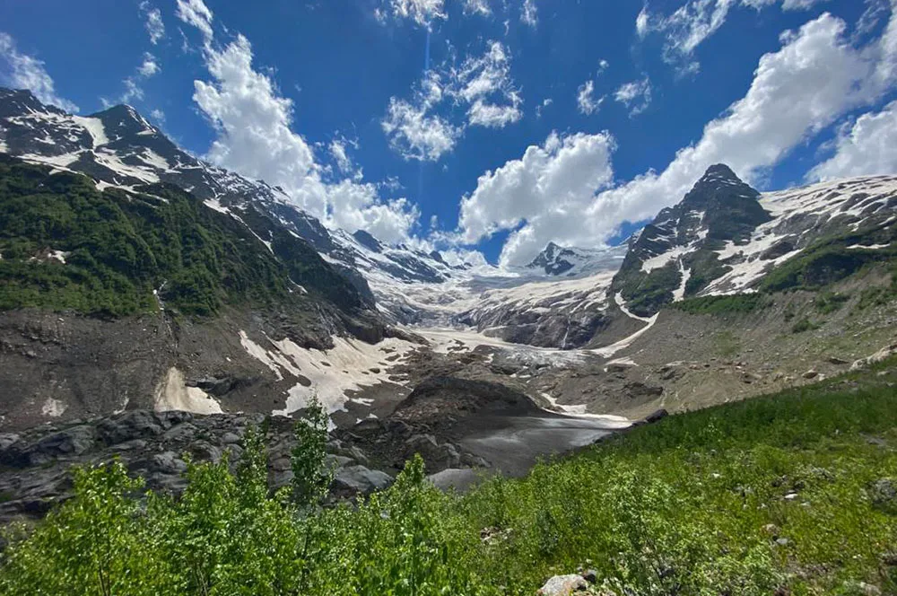 Представьте себе гигантское поле из спрессованного снега и льда площадью почти 1000 гектаров. Лед здесь не белый, а имеет глубокий голубой и бирюзовый оттенок. Поверхность изрезана трещинами, глубина которых может достигать 60 метров. Особое внимание туристов привлекают ледяные гроты — пещеры, вымытые талой водой внутри ледяной толщи. Отсюда открывается невероятная панорама гор и вид на вершины Эрцог и Джаловчат.