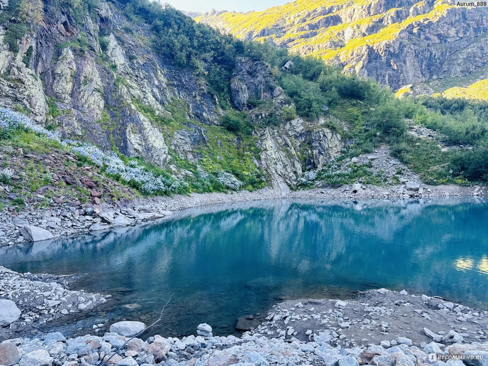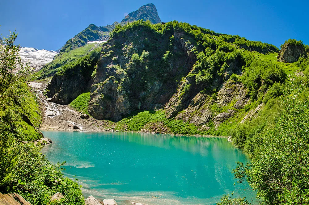 Турье озеро Домбай поражает своим цветом. Вода здесь имеет насыщенный интенсивно-бирюзовый, иногда молочно-голубой оттенок. Озеро небольшое, но очень глубокое. Даже в середине лета на его поверхности часто плавают льдины, напоминая маленькую Антарктиду. Температура воды редко поднимается выше +3 градусов, поэтому купаются здесь только самые закаленные моржи. Это классическое озеро с бирюзовой водой, ради фотографий которого люди готовы преодолевать крутые подъемы.