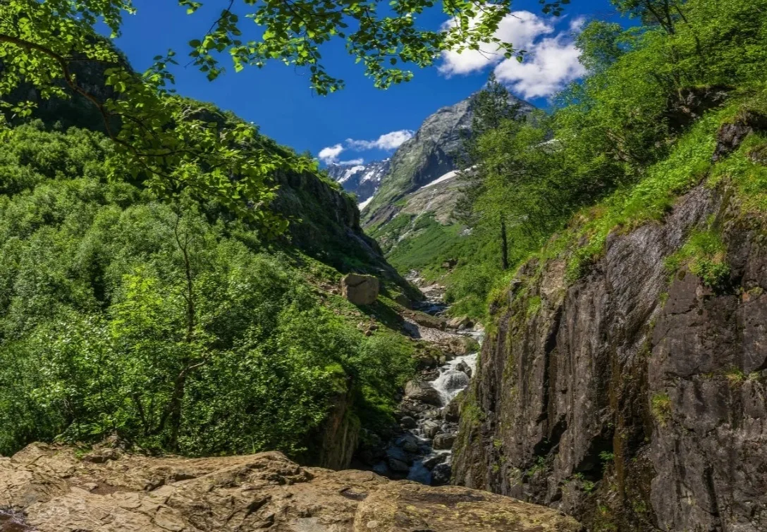Самое узкое и драматичное ущелье в окрестностях курорта. Высокие скалы здесь смыкаются так плотно, что в некоторые участки солнце заглядывает лишь на пару часов в день. По дну каньона с ревом несется бурная река Аманауз, пробивая себе путь через каменные завалы. Пейзаж здесь суровый, но завораживающий: вековые пихты, огромные валуны и нависающие скалы создают атмосферу первозданной дикости. Даже в ясный день здесь может царить полумрак, оправдывая название мрачное ущелье. Это настоящий музей природы под открытым небом, где можно увидеть следы схода лавин и мощь водной стихии.