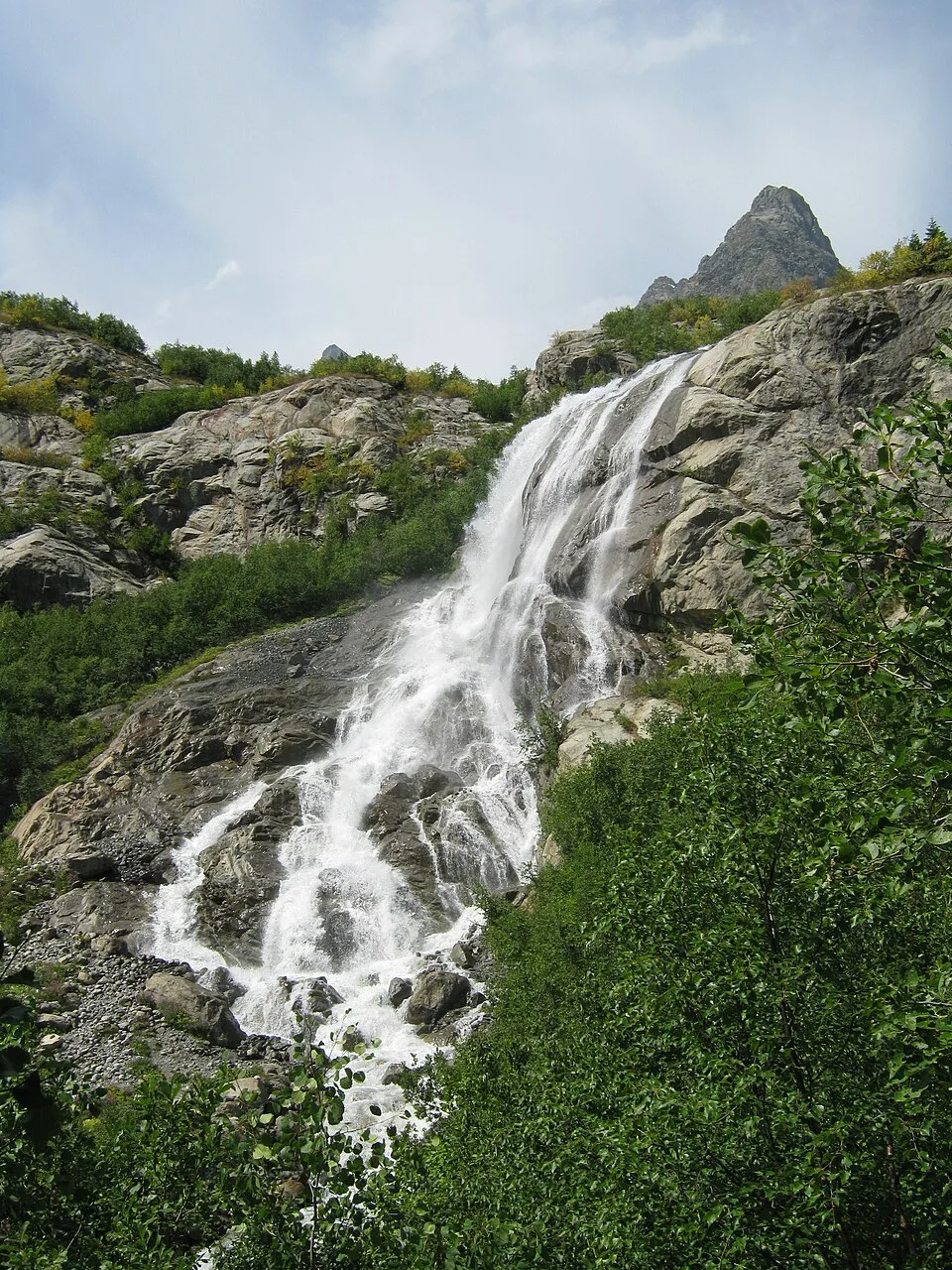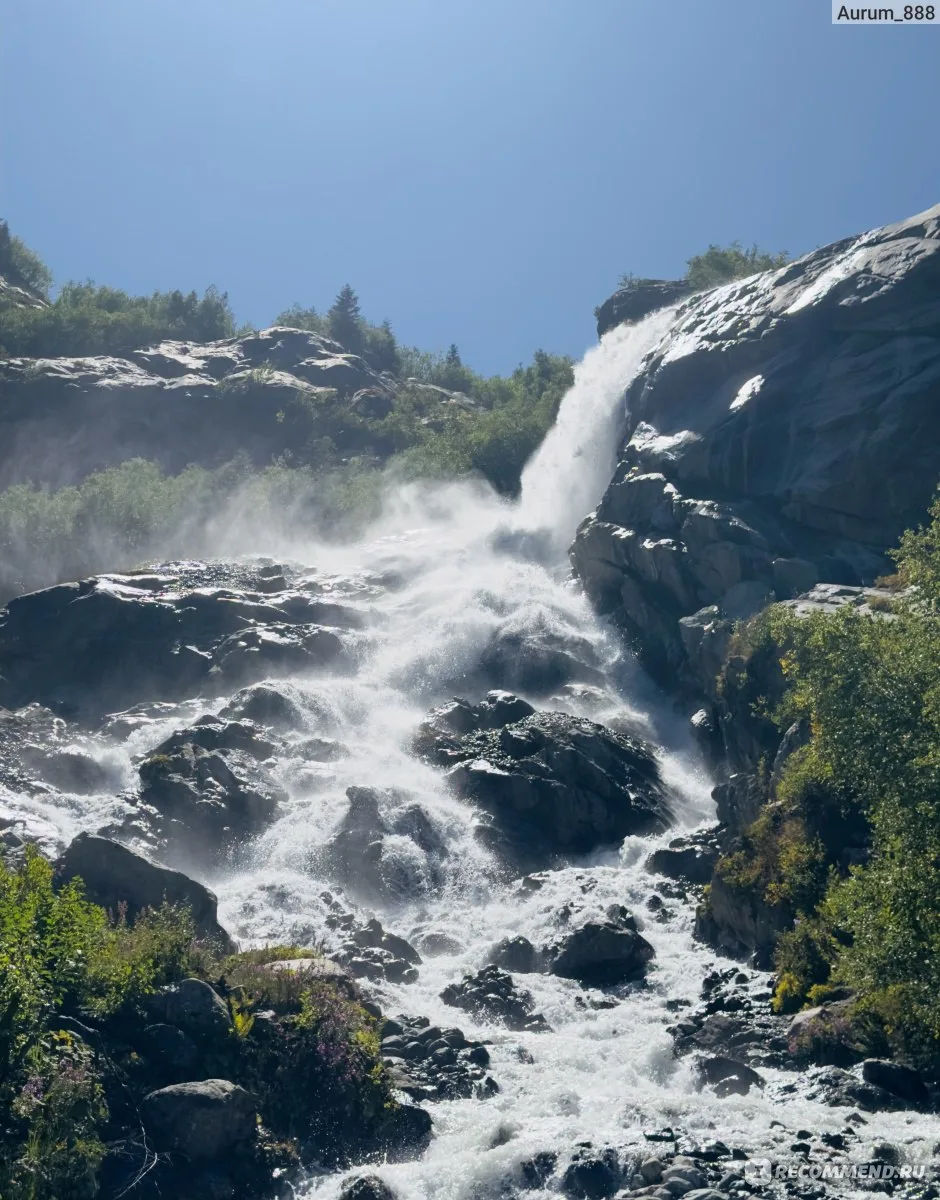 Это самый мощный водопад Домбая, высотой около 25 метров. Зрелище завораживает своей дикой энергией: огромные потоки воды с ревом падают вниз, разбиваясь о камни и поднимая облака водной пыли. В солнечный день здесь почти всегда висит радуга. Вокруг водопада растут березовое криволесье и рододендроны, создавая живописный контраст с суровыми скалами. Шум воды слышен задолго до того, как вы увидите сам поток.