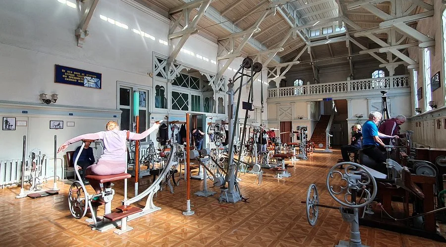 Здание института само по себе притягивает взгляд. Это изящный павильон в стиле фахверк (каркасная конструкция), напоминающий сказочный терем с башенками и шпилями. Оно построено из дерева и кирпича, что придает ему особый шарм на фоне монументальных каменных галерей. Внутри время словно остановилось. В просторном зале стоят десятки диковинных механизмов: сиденья обтянуты толстой кожей, рычаги блестят металлом, слышен мерный стук работающих аппаратов. Это те самые тренажеры Цандера. Они делятся на две группы: для активных упражнений (где пациент прилагает усилия) и для пассивных (где аппарат сам сгибает и разгибает конечности или делает массаж). Это настоящий прообраз современных фитнес-центров, только здесь царит атмосфера спокойствия и старины.