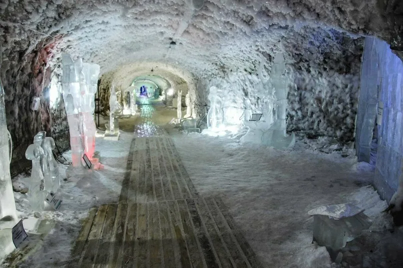 Грот представляет собой небольшую рукотворную пещеру (штольню), уходящую вглубь горы на несколько сотен метров. Однако туристам доступна только входная часть. Самое впечатляющее здесь — это резкий температурный контраст. Сделав всего шаг с солнечной тропинки к входу в грот, вы мгновенно попадаете в царство холода. Даже в самый знойный июльский день температура внутри держится около 0...+4 °C. Стены покрыты инеем, а изо рта идет пар. Это явление называют летняя мерзлота. Зимой происходит обратный процесс: из недр горы выходит теплый воздух, и температура внутри оказывается выше, чем на улице. Из-за особого микроклимата камни вокруг входа покрыты редкими видами мхов, которые обычно растут только в тундре, далеко на севере.