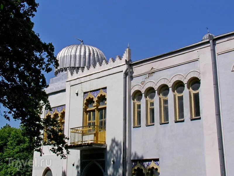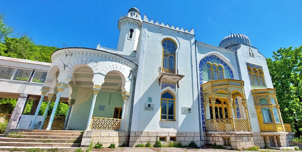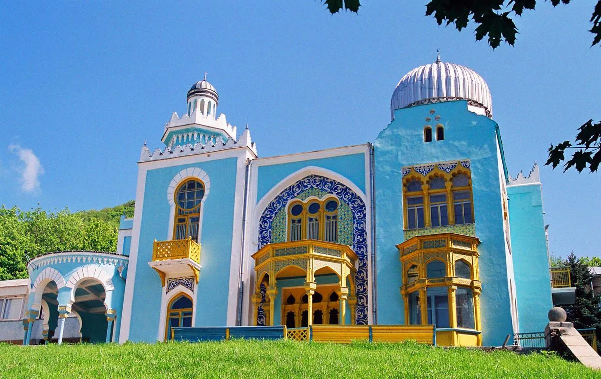 Это самое экзотическое здание города, ярко выделяющееся на фоне классической европейской архитектуры курорта. Дворец выполнен в восточном стиле (мавританский стиль с элементами модерна). Он напоминает резную шкатулку: сложные орнаменты, ажурные балконы, окна подковообразной формы и зубчатые карнизы. Главная доминанта комплекса — высокая башня, стилизованная под минарет. Фасад украшен керамической мозаикой небесно-голубого цвета, которая перекликается с небом Кавказа. Вход в здание охраняют каменные львы, ставшие любимцами туристов. Этот архитектурный памятник сохранился практически в первозданном виде снаружи, хотя внутренние интерьеры (камины, деревянная резьба) претерпели изменения в советские годы.
