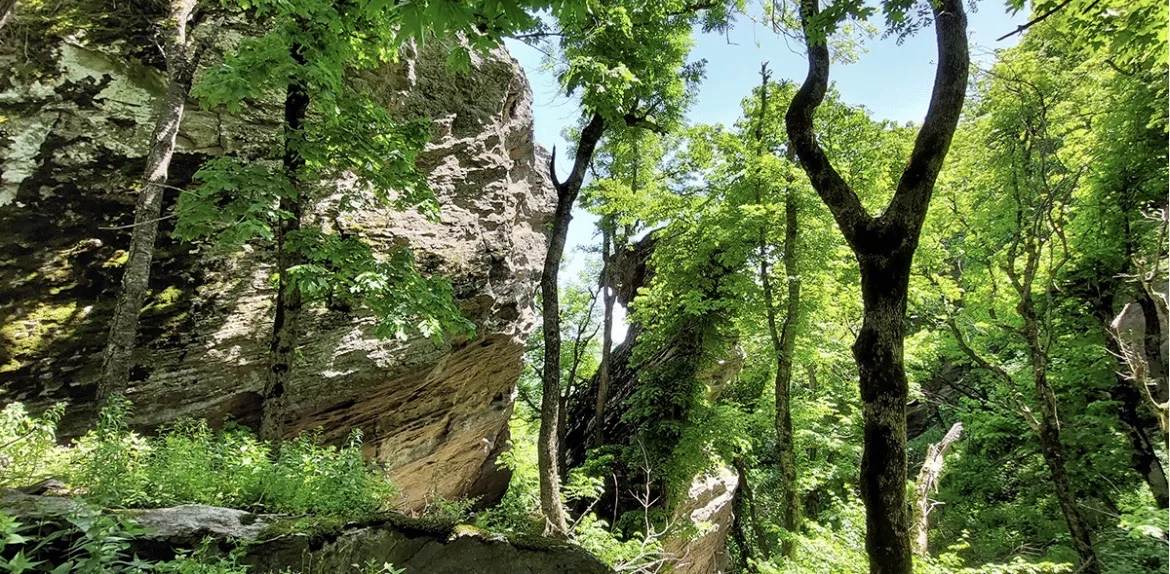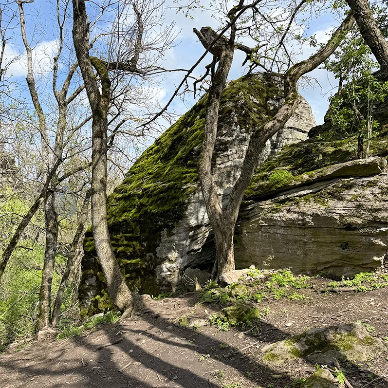 Это место часто называют «каменным городом». Скалы представляют собой не единый монолит, а гряду вертикальных утесов, разбросанных в густом лесу. Стены покрыты толстым слоем мха, лишайника и плюща, что придает им вид декораций к фильму-фэнтези. Главная особенность локации — небольшая сквозная пещера в скале, через которую можно пролезть и оказаться на смотровой площадке. С вершины открывается редкий ракурс на гору Развалку и Змейку, недоступный с обычных асфальтированных дорожек. Здесь тихо, сумрачно и очень атмосферно, в отличие от людных аллей Курортного парка.