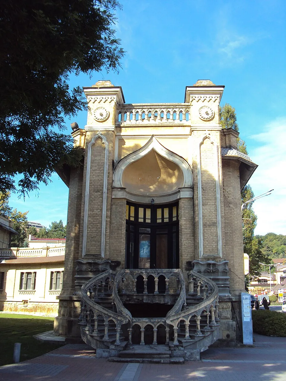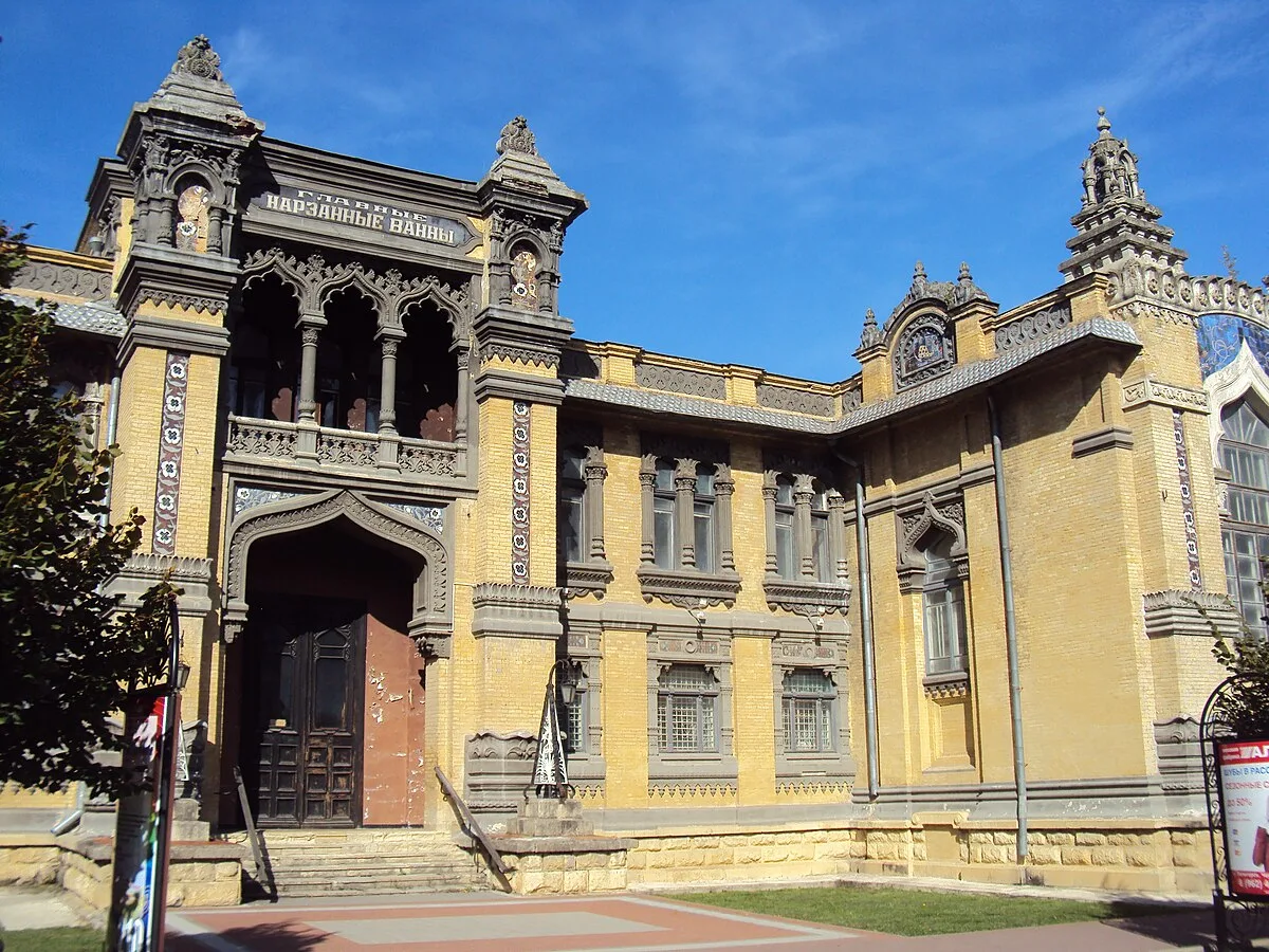 Если не знать, что это лечебница, можно подумать, что перед вами дворец индийского раджи или эмира. Здание выполнено в экзотическом мавританском стиле: желтый кирпич, причудливая лепнина, башенки и арочные окна. Фасады украшены уникальной майоликой (керамической плиткой). Главная художественная ценность — это керамические панно Врубеля (созданные в мастерской «Абрамцево» по эскизам художника), которые украшают фронтоны. Интерьеры не уступают внешнему виду: резные лестницы, высокие потолки и атмосфера роскоши. Сейчас внутри располагается элитный санаторий и отель, но оценить архитектуру Клепинина можно и снаружи — это самое фотографируемое здание в городе.