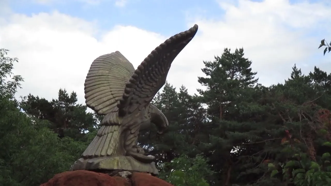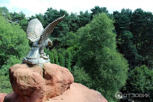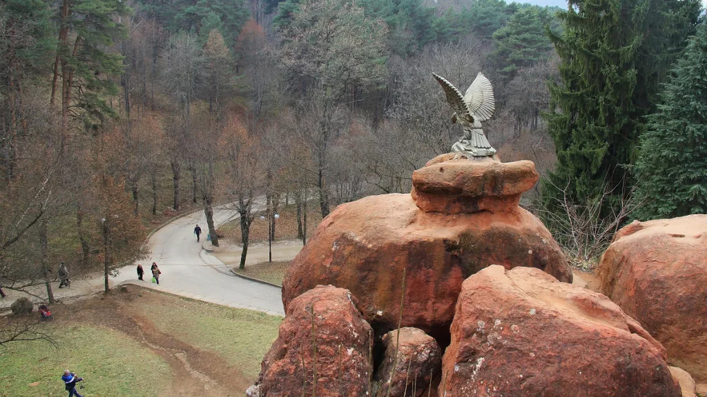 Это тот случай, когда название полностью отражает суть. Группа скал действительно имеет насыщенный красно-кирпичный цвет. Такой оттенок породе придают гидроксиды железа (по сути — ржавчина), которыми пропитан песчаник. На фоне сочной зелени парка эти рыжие утесы смотрятся очень контрастно. На вершине одной из скал, расправив крылья, застыл бронзовый орел. Это, пожалуй, самая популярная точка для фото с орлом в городе — снимки получаются эпичными, так как птица находится на возвышении. Сами камни образуют естественную смотровую площадку, откуда открывается шикарная панорама города и вид на купола Свято-Никольского собора.
