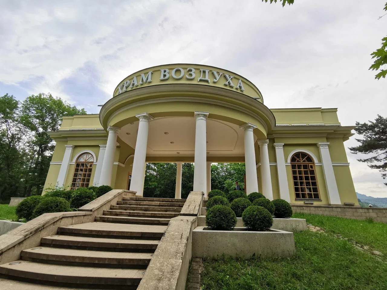 Здание представляет собой классическую полуротонду с большими арочными окнами, обращенными на восток и юг. Стиль — неоклассицизм: строгие линии, белые колонны, широкая лестница. Павильон Храм воздуха стоит на высоком уступе, словно паря над зеленом морем парка. Внутри сейчас светло и просторно. Оконные проемы не застеклены наглухо в летнее время (или имеют особую конструкцию), чтобы оправдывать название — воздух здесь циркулирует свободно. Это идеальная смотровая площадка: через арки, как через рамы картин, открываются виды на Эльбрус и Джинальский хребет. В солнечный день белизна стен на фоне синего неба выглядит просто ослепительно.