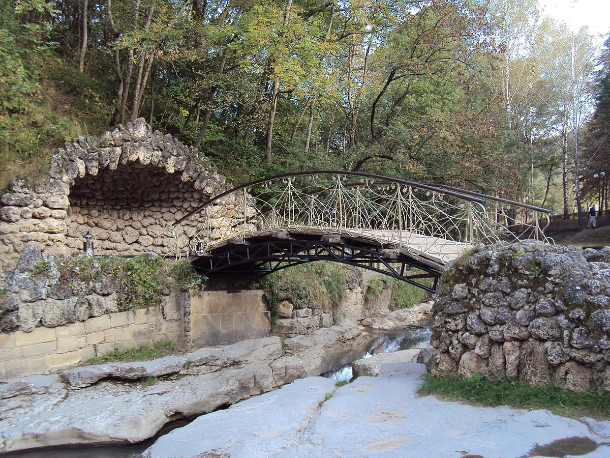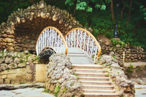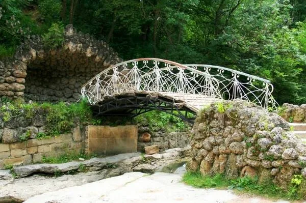 Это небольшая, но очень фотогеничная арочная конструкция с белыми резными перилами. Мостик перекинут через каменистое русло реки в очень живописном месте: вода здесь шумит особенно громко, разбиваясь о валуны, а берега утопают в зелени. Сразу за мостиком находится уютный рукотворный грот — Грот Любви. Это небольшая пещера со скамейкой, где любят уединяться влюбленные пары. Вся эта локация словно создана для свиданий. Ажурная решетка моста на фоне бурной реки и скал делает это место идеальным для фотосессии на мосту — кадры получаются живыми и контрастными.