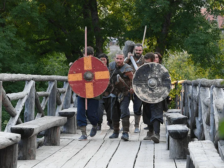 В 2015 году в Крыму проходили съемки масштабного российского исторического фильма «Викинг» с Данилой Козловским в главной роли. Для съемок были построены огромные декорации средневекового скандинавского поселения VIII–XI веков. После завершения работы над картиной создатели решили не разбирать уникальные постройки, а перенести их в живописную горную долину возле Красных пещер и превратить в первый в России интерактивный парк исторической реконструкции.