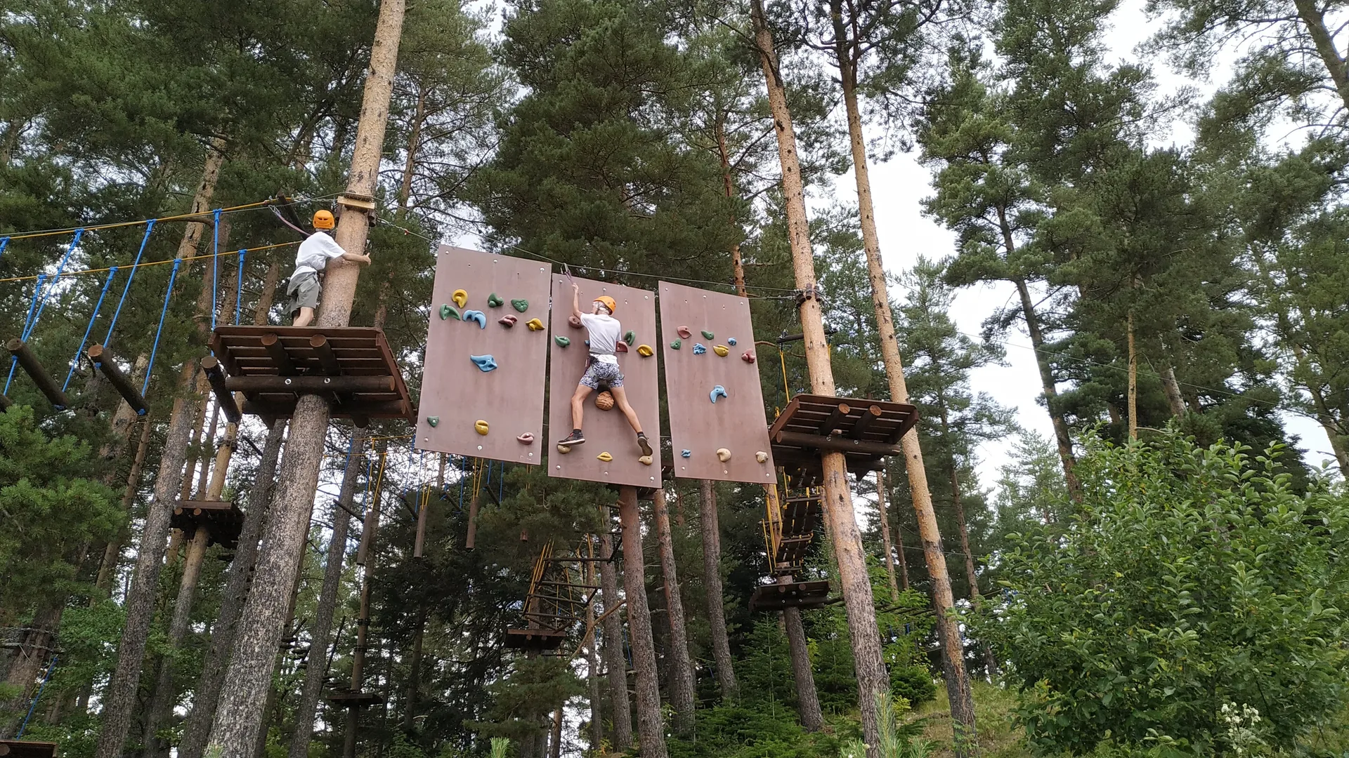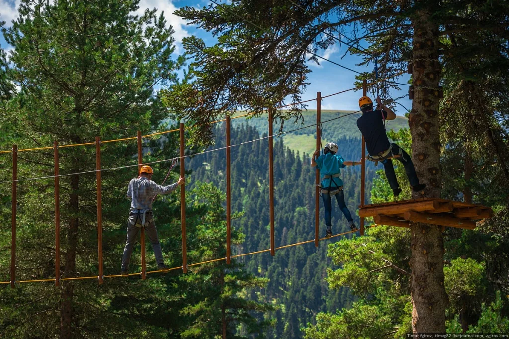 Это комплекс подвесных препятствий разной сложности, натянутых между деревьями. Здесь есть шаткие мостики, сетки, тарзанки и переправы. Трассы разделены по уровням: от простых детских, расположенных низко над землей, до экстремальных взрослых маршрутов на высоте крон деревьев. Это отличный активный отдых Романтик для всей семьи.