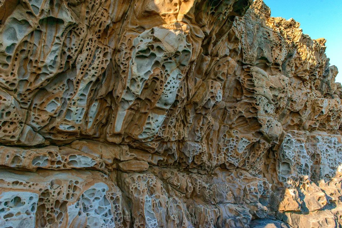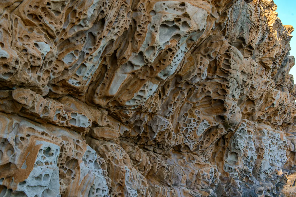 Формирование этого природного шедевра началось миллионы лет назад. Секрет "сырной" формы заключается в ячеистом выветривании. Скалы состоят из кварцитового песчаника, который имеет неоднородную структуру. Ветер, морская соль, волны и солнце веками вымывали и выдували более мягкие породы, оставляя твердый каркас. В результате образовался удивительный рельеф, усыпанный глубокими кавернами, гротами и дырочками разного размера.