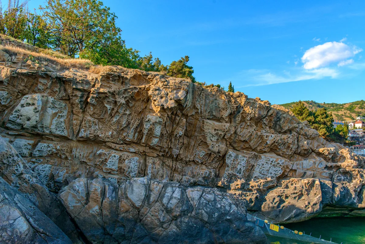 Официальное географическое название этого места — массив Малореченский каменный хаос и скала Тузлух (в переводе «солонка»). Но в народе за ними прочно закрепилось название Сырные скалы. Желтоватый оттенок камня и гладкие ячейки действительно делают обрывы похожими на гигантские куски маасдама или эмменталя. Место невероятно живописное: здесь получаются самые стильные фотосессии в Алуште. Скалы обрываются прямо в море, образуя скрытые микро-бухточки с прозрачной водой — настоящие дикие пляжи ЮБК.