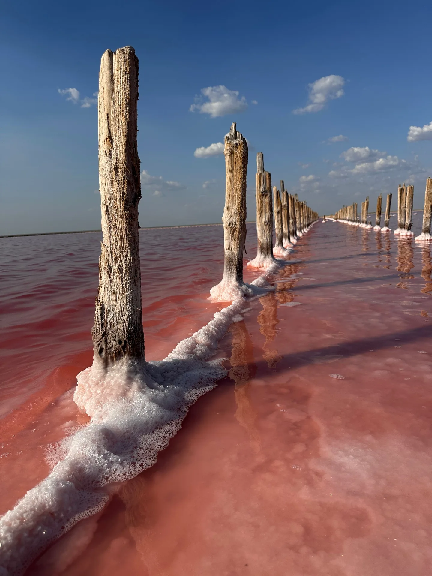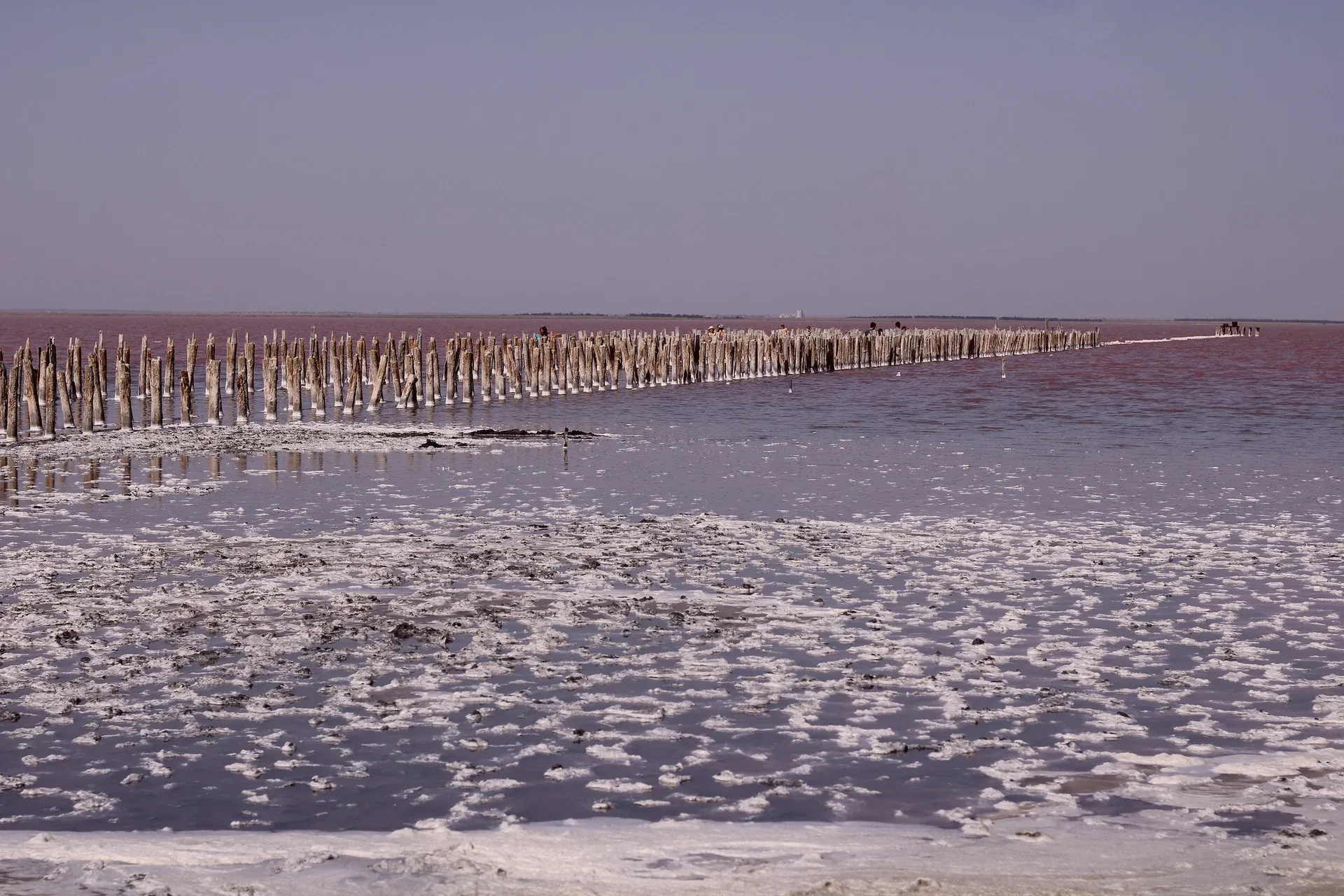 Озеро Сасык-Сиваш — главная фото-локация западного побережья. Вода здесь имеет насыщенный розовый или красноватый цвет из-за цветения водоросли Дуналиелла солоноводная. Именно здесь находятся знаменитые деревянные столбики (остатки мостков для добычи соли), уходящие в розовую даль, которые вы наверняка видели в соцсетях. Часть озера пресная, и там живут сотни белых лебедей, которых можно кормить с рук.