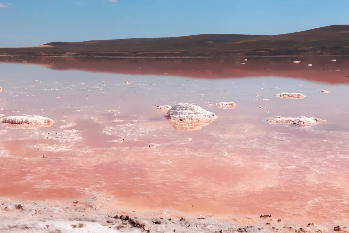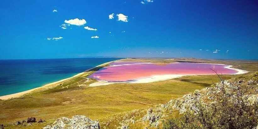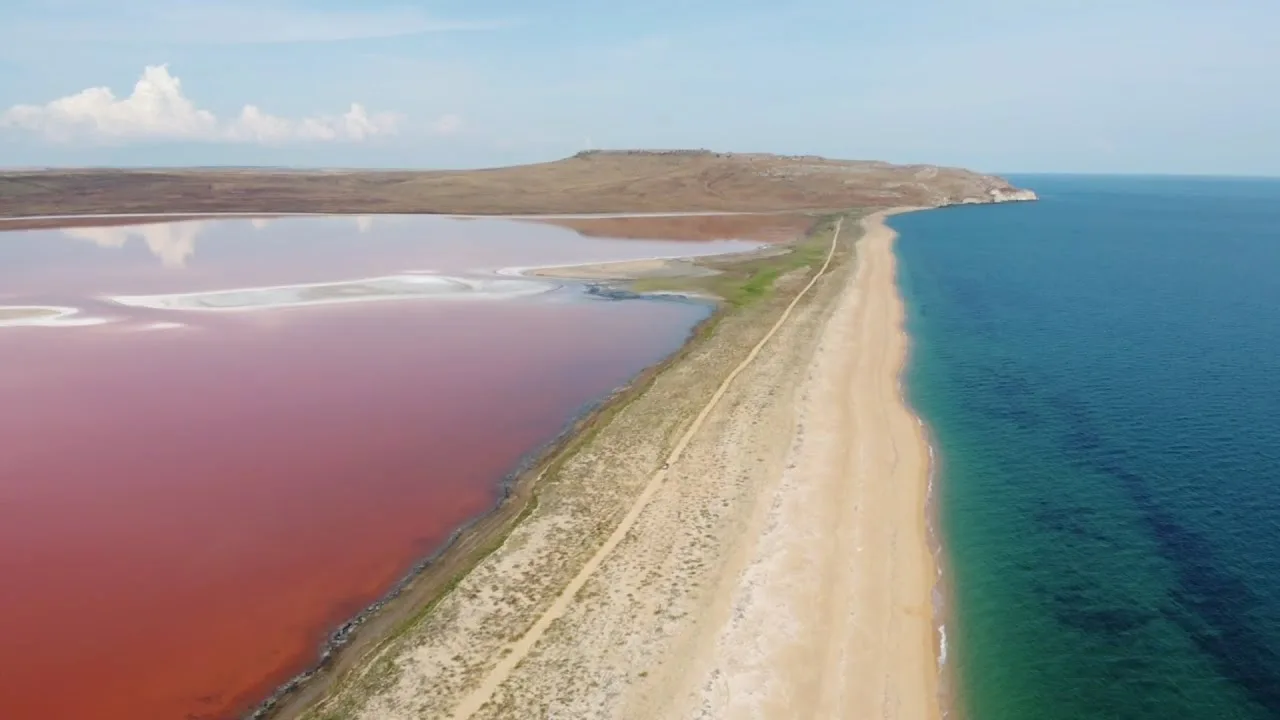 Это самое соленое озеро Крыма и, пожалуй, самое фантастическое. Главная особенность — цвет воды. Благодаря микроскопической водоросли и рачку артемия, вода приобретает оттенки от нежно-розового до насыщенно-красного и фиолетового. Чем жарче лето, тем ярче цвет. Кояшское озеро на фото выглядит как инопланетный пейзаж: розовая вода, белые берега из кристаллизованной соли и голубое небо. В засушливый период по поверхности озера можно ходить, как по льду, но это соляная корка.