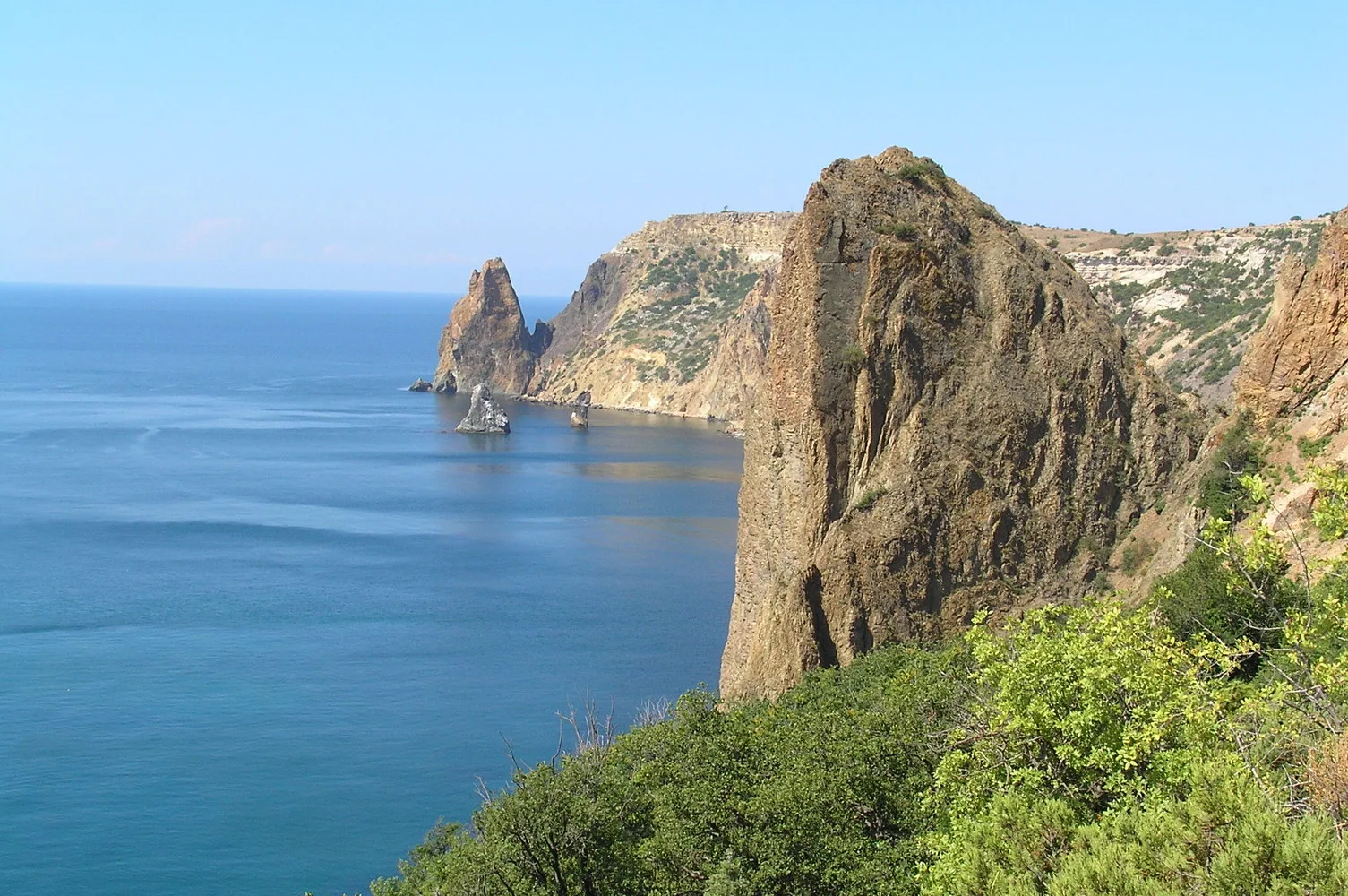Мыс Фиолент в Севастополе — это место суровой вулканической красоты. Скалы здесь состоят из пород вулканического происхождения, чередующихся полосами лавы и туфов, что создает «тигровый» окрас обрывов. Вода на Фиоленте считается одной из самых чистых и прозрачных в Крыму, имея насыщенный изумрудный или синий цвет. Главная точка притяжения — Яшмовый пляж, над которым нависают грандиозные скалы.