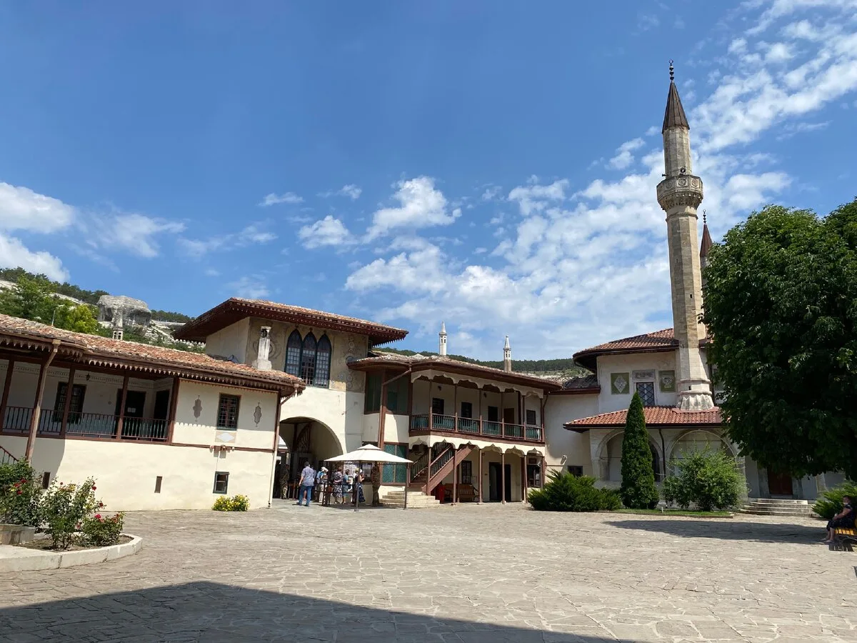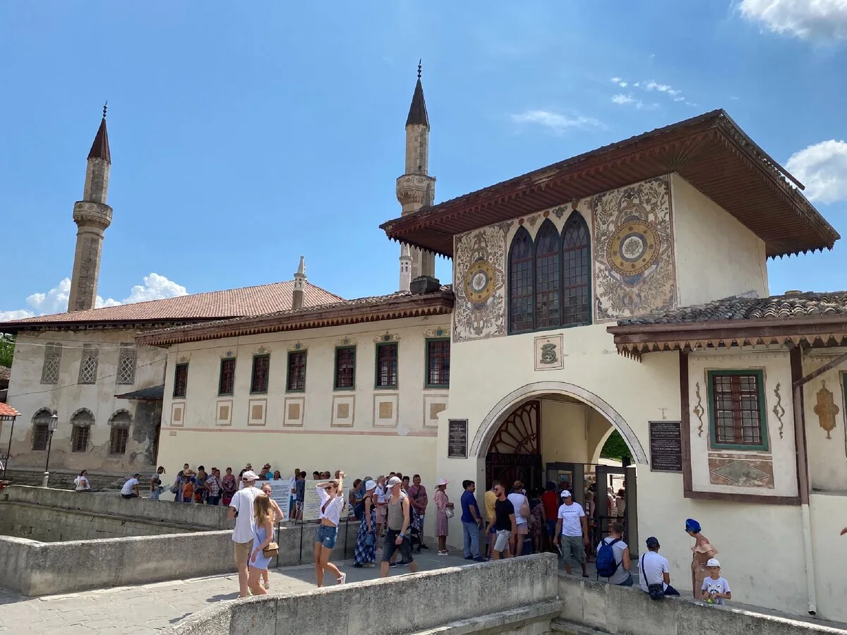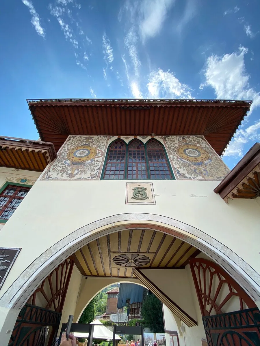 Дворец задумывался как земное воплощение райского сада. Комплекс включает в себя Северные и Южные ворота, Свитский корпус, Большую ханскую мечеть с двумя минаретами, баню Сары-Гюзель, Соколиную башню и гарем. Внутренние дворики утопают в зелени и цветах. Главная точка притяжения — знаменитый «Фонтан слёз», воспетый Пушкиным. Крымскотатарская архитектура здесь представлена во всем великолепии: расписные потолки, витражи, уютные дворики.