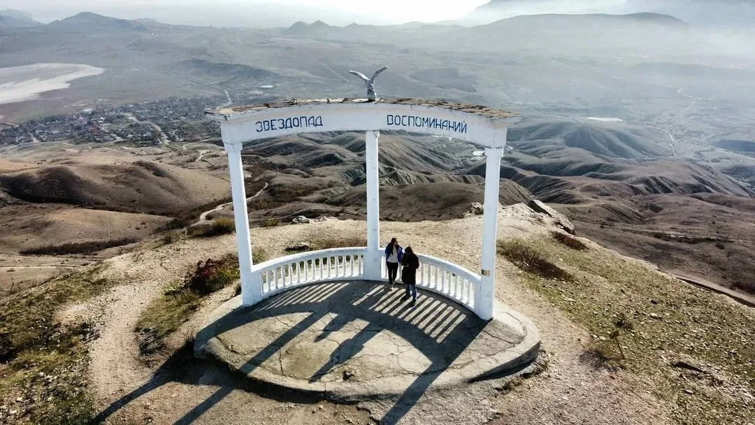 Белоснежная ротонда Крыма, состоящая из трех колонн, перекрытых полукруглым архитравом, стоит на самом краю отвесного обрыва на высоте 345 метров над уровнем моря. Звездопад воспоминаний — это безупречная смотровая площадка Коктебеля. Отсюда открывается панорамный обзор на 360 градусов: на горизонте виднеются мертвые соленые озера, зеленая Аманатская долина, знаменитая гора Клементьева и величественные виды на Кара-Даг. В ясную погоду кажется, что весь Восточный Крым лежит как на ладони.