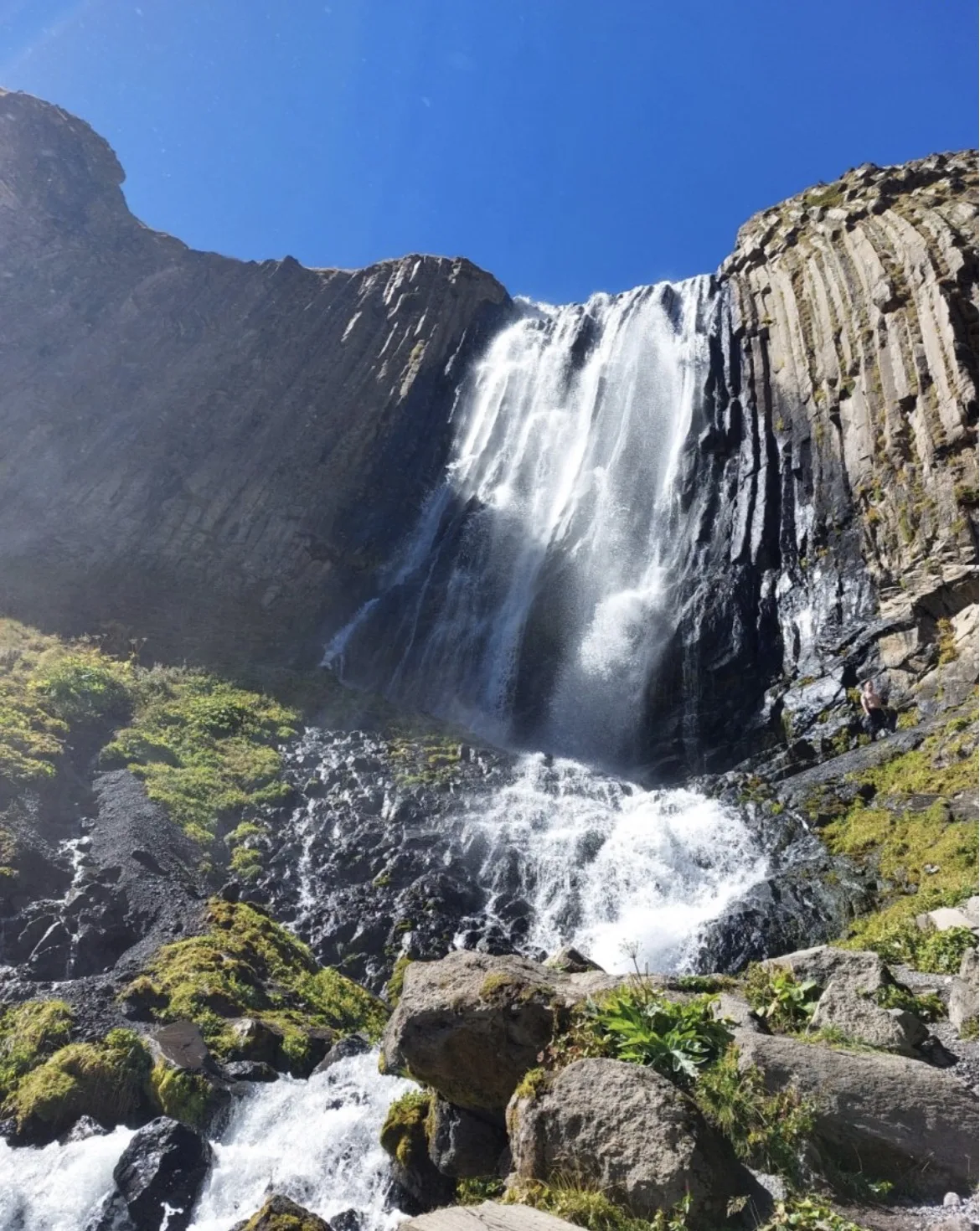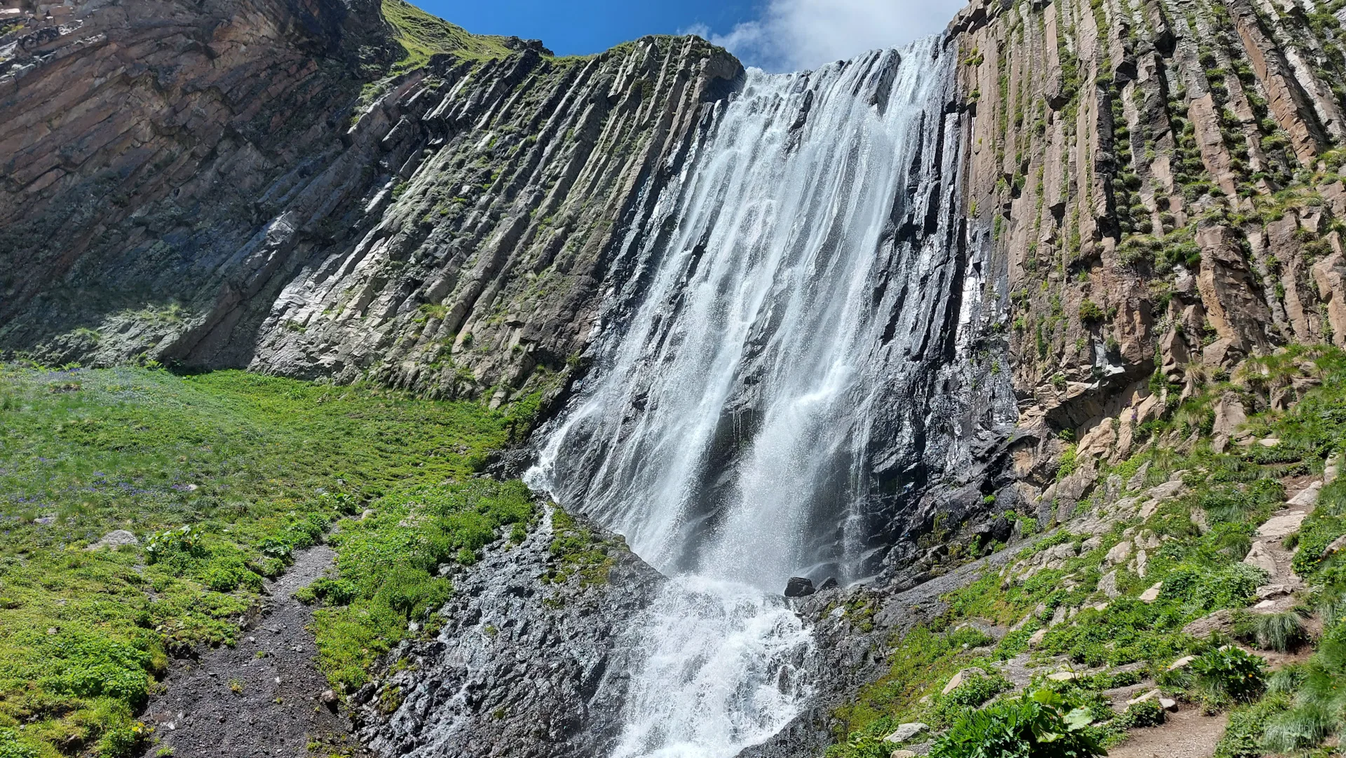 Если вы ищете мощь и грохот воды, вам сюда. Водопад Терскол находится в тупике одноименного ущелья, где вода с ревом падает в каменный "мешок". Сама дорога к нему, возможно, даже красивее цели: вы идете по дну ущелья Терскол, вдоль бурной реки, мимо альпийских лугов с пасущимися лошадьми. В конце пути открывается вид на нависающий ледник Терскол, из которого и рождается этот поток. Это одни из самых красивых мест Кавказа для фотосессий без толп людей.
