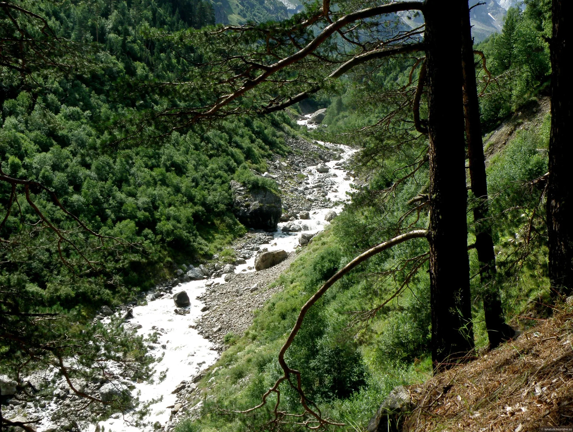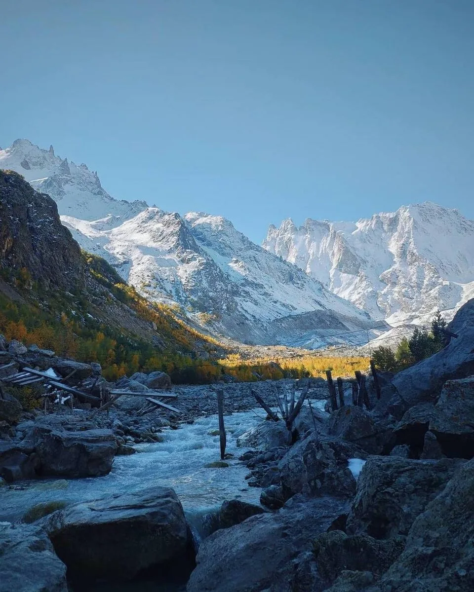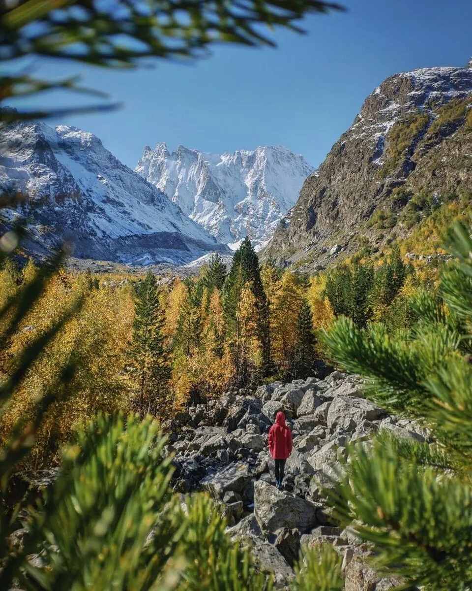 Маршрут для тех, кто любит дикую природу. Ущелье Шхельда — это узкий каньон с бурной рекой, окруженный отвесными скалами. Тропа петляет через сосновый лес, выходя к "Пляжу улыбок" — месту в пойме реки, где туристы разрисовывают камни смайликами. Главная цель пути — вид на грозную Шхельдинскую стену и ледник. Это настоящий, серьезный треккинг в Приэльбрусье, требующий внимания, но доступный людям со средней подготовкой.