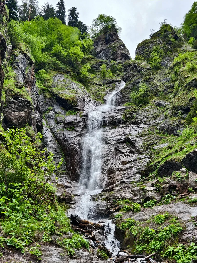Казачий водопад спрятан в густом пихтовом лесу. Это узкий, но стремительный поток, который пробил себе путь в скале. Вода здесь ледяная и очень вкусная. Место очень атмосферное: вокруг вековые деревья, камни, поросшие мхом, и полумрак даже в самый солнечный день. Это настоящая прогулка по лесу Архыз, где чувствуется уединение.