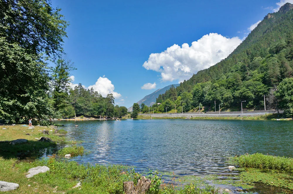 Название Кара-Кёль переводится с тюркского как «Черное озеро». Вода здесь действительно кажется очень темной, почти черной. Такой оптический эффект создается из-за огромной глубины и отражающихся в зеркальной глади густых хвойных лесов, подступающих прямо к берегам. В отличие от ледяных высокогорных водоемов, летом вода здесь хорошо прогревается, поэтому отдых на озере Теберда так популярен среди туристов. Береговая линия частично облагорожена.