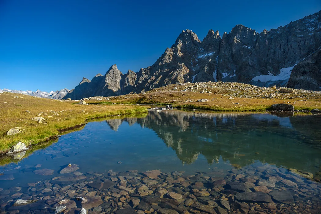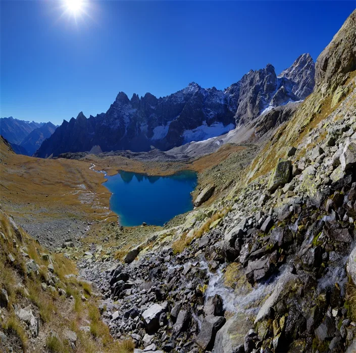 Это огромное, суровое и невероятно мощное по энергетике горное озеро. Оно раскинулось в огромном каменном цирке, со всех сторон зажатом отвесными гранитными стенами и заснеженными пиками. Вода здесь свинцово-синяя, ледяная и очень прозрачная. В отличие от популярных прогулочных маршрутов, природа здесь кажется более дикой, нетронутой и величественной, идеально подходящей для тех, кто ищет уединенный отдых в горах Кавказа.