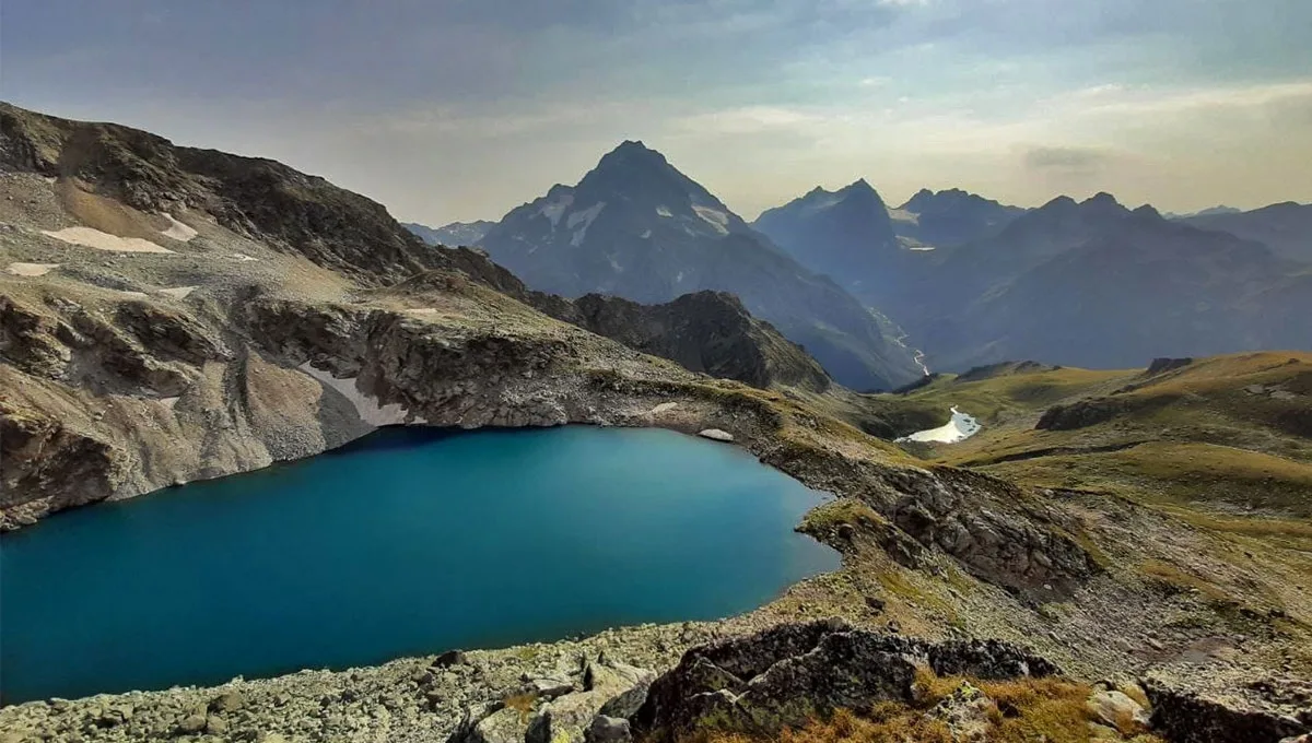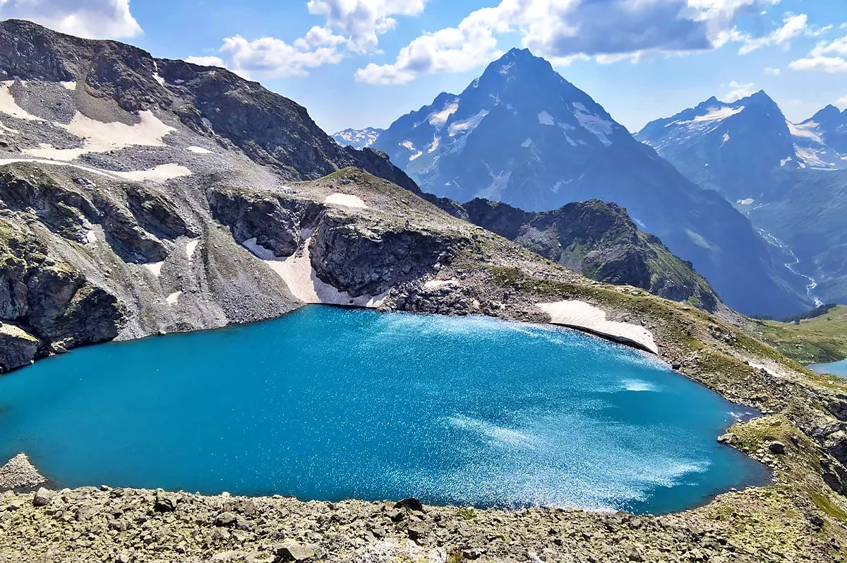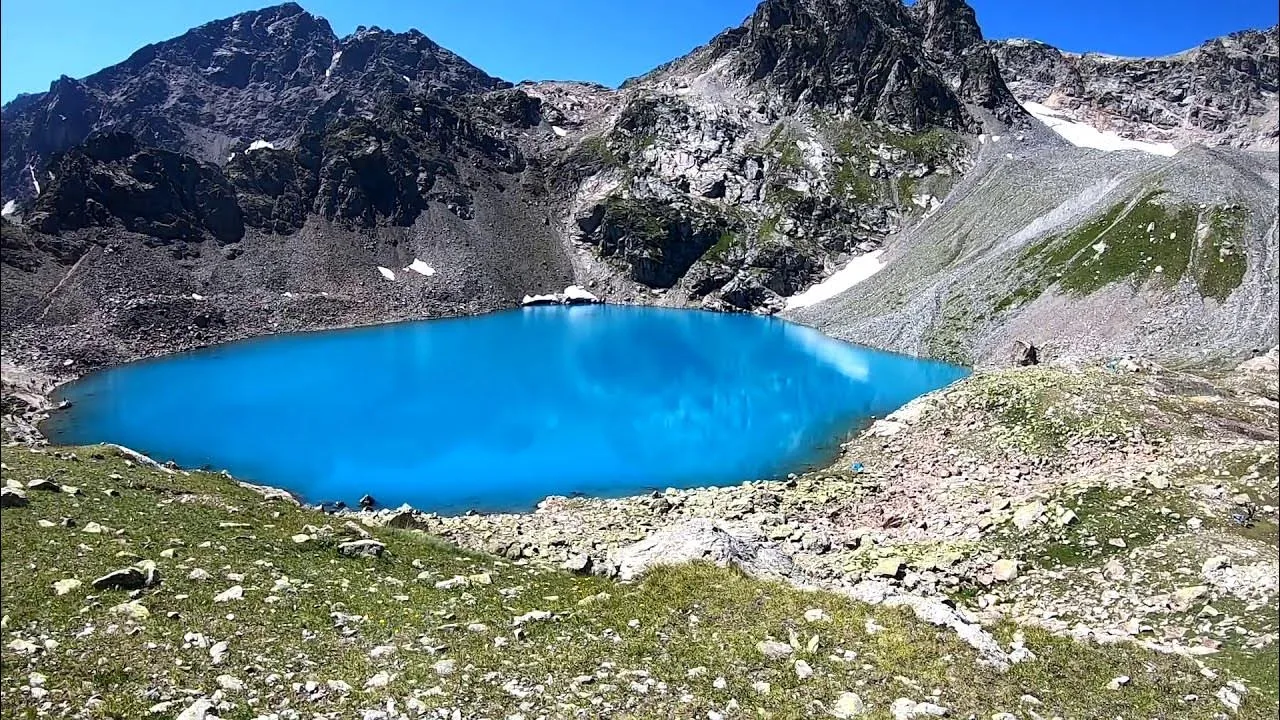 Это суровое и величественное озеро. Вода в нем темно-синяя, почти черная из-за большой глубины. Берега каменистые, растительности практически нет, только голые скалы и снежники. Атмосфера здесь строгая, почти космическая. Это место для тех, кто ищет тайные места гор и тишину.