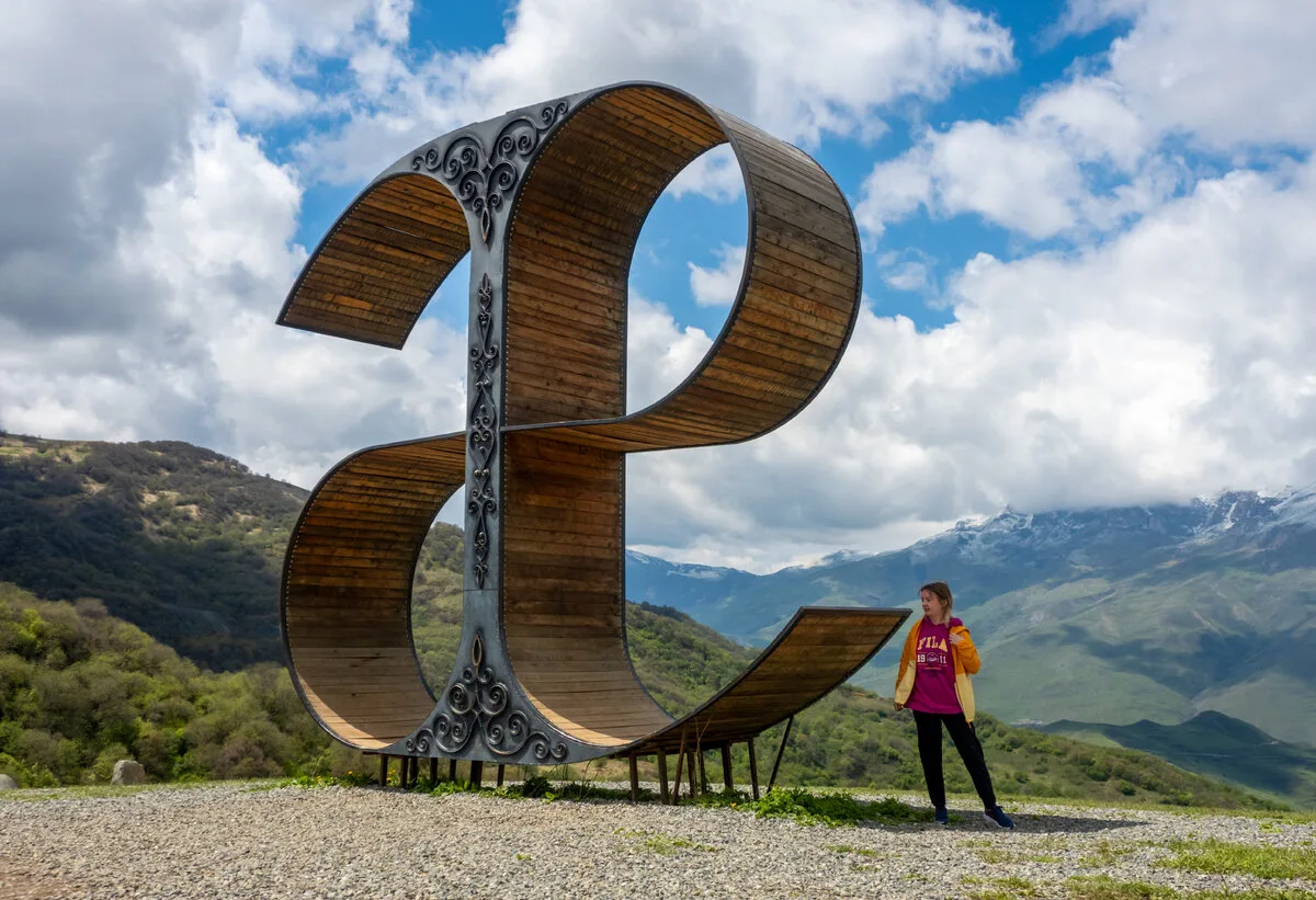Это крупная объемная инсталляция, искусно выполненная из дерева и металла. Знаменитая буква Ае Осетия установлена на вершине открытого зеленого холма, откуда открывается живописный круговой обзор на скалистые горные хребты. Естественная деревянная фактура памятника превосходно гармонирует с окружающим природным ландшафтом, делая скульптуру идеальным контрастным фоном для памятных туристических снимков.