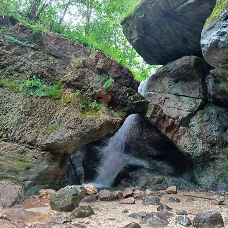 Это один из самых необычных каскадов в республике. Водопад Кольцо Осетия представляет собой мощный поток кристально чистой ледяной воды, который срывается не просто с уступа скалы, а вырывается прямо сквозь каменное кольцо (карстовую воронку). Диаметр этого природного отверстия составляет несколько метров. Вода падает в небольшую живописную чашу, окруженную густым зеленым лесом, мхами и папоротниками. Это место отлично демонстрирует, насколько разнообразна и удивительна природа Куртатинского ущелья.