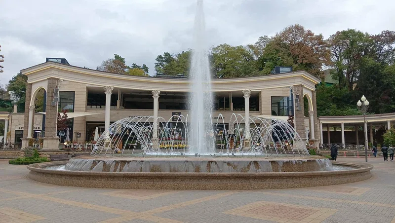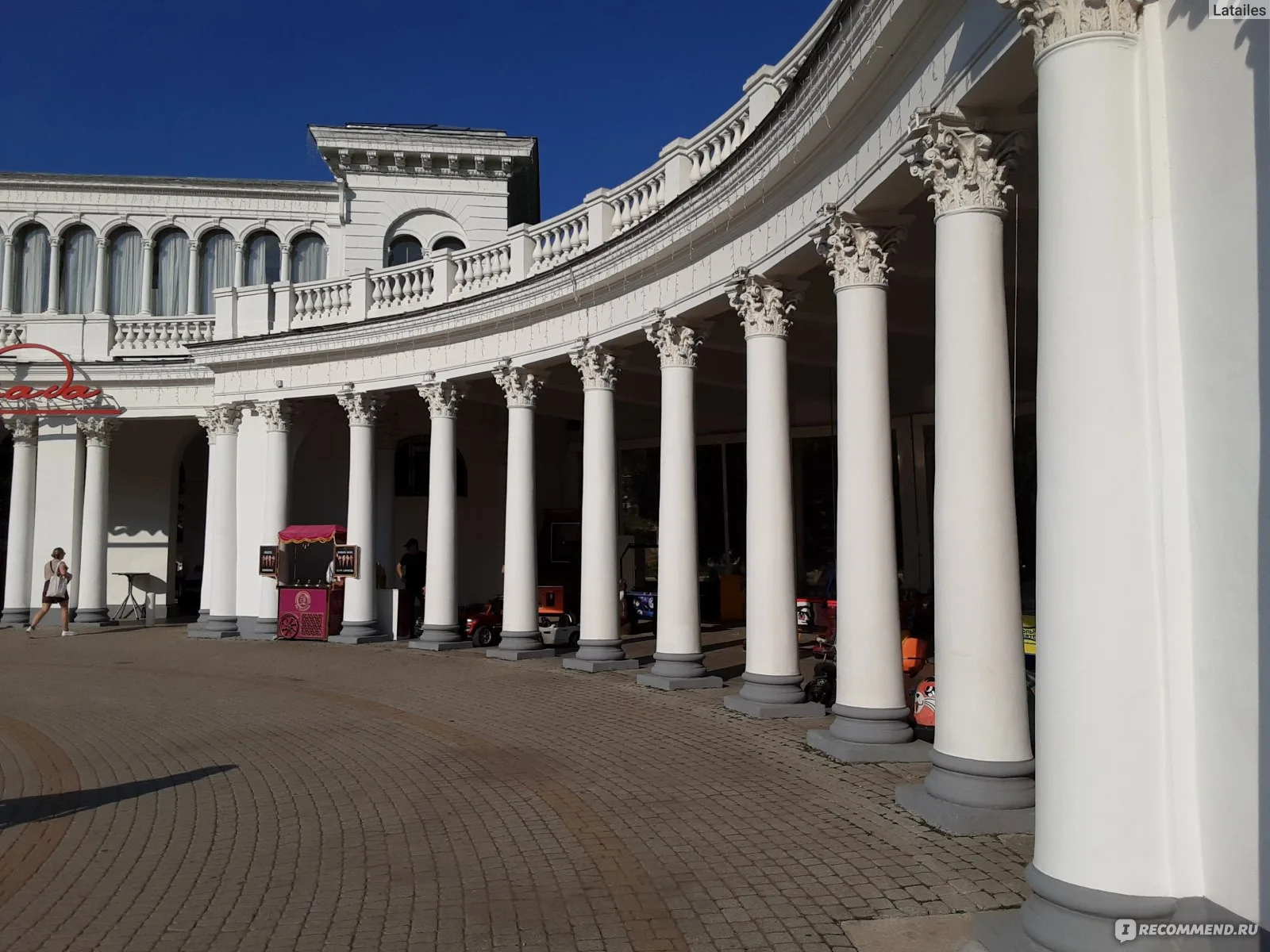 Конструкция представляет собой двухъярусное полукруглое сооружение, выполненное в классическом стиле. Белоснежные коринфские колонны выстроены в два ряда, создавая ощущение воздушности и легкости, несмотря на массивность камня. Первый ярус — это сквозной проход, те самые «ворота». Второй ярус — это терраса с балюстрадой, где раньше любила гулять аристократия. Сегодня это визитная карточка курорта, которую печатают на всех магнитах и открытках. Если вы хотите сделать классические фото достопримечательностей, вам точно сюда. Особенно эффектно здание смотрится на фоне густой зелени парка или вечером, когда включается архитектурная подсветка.